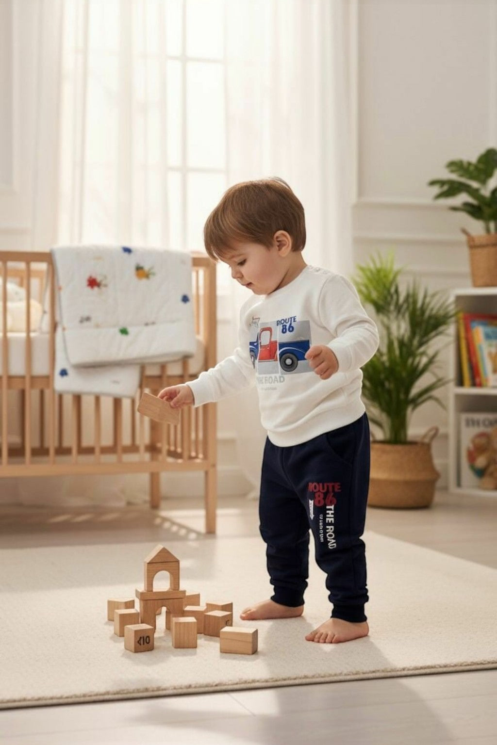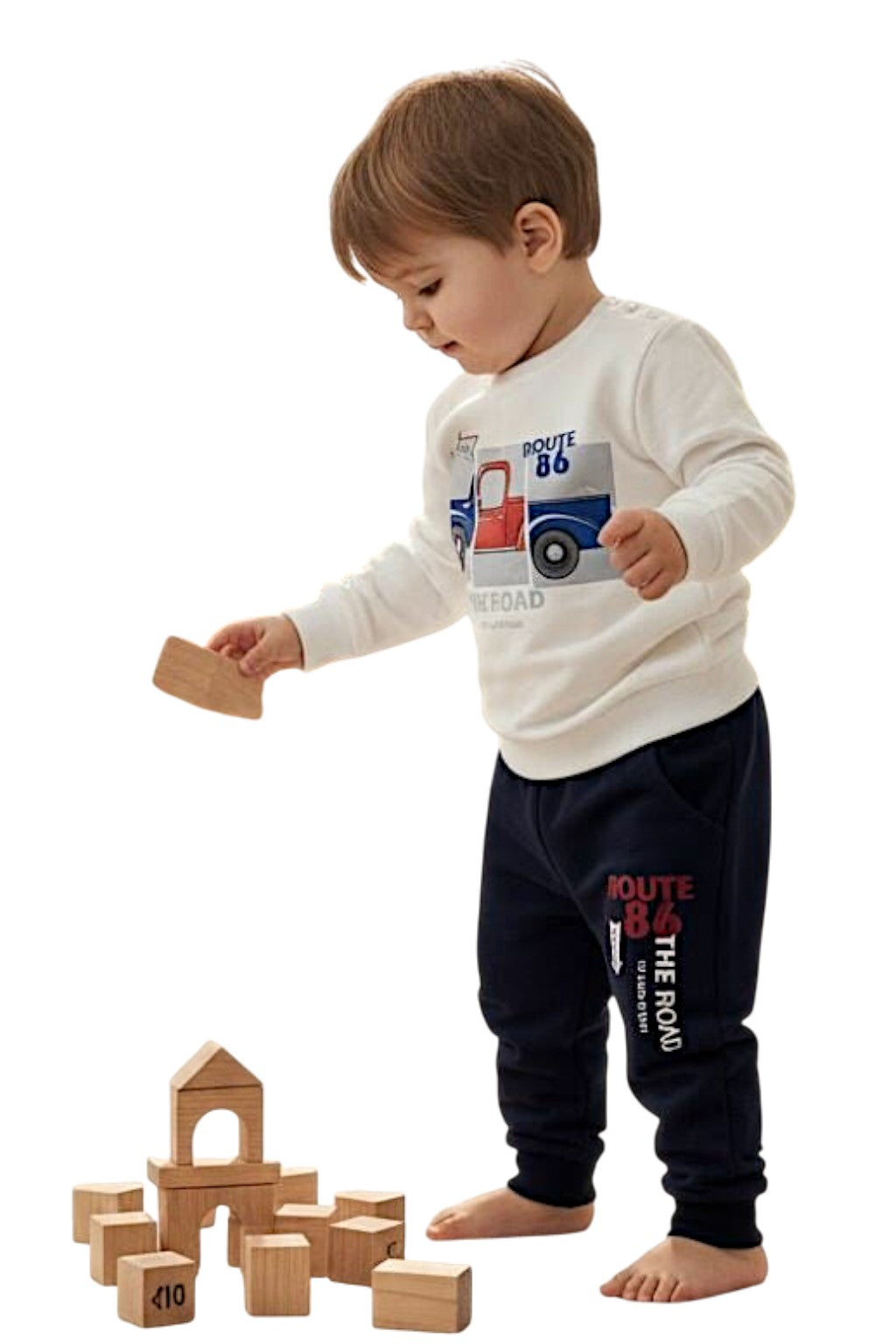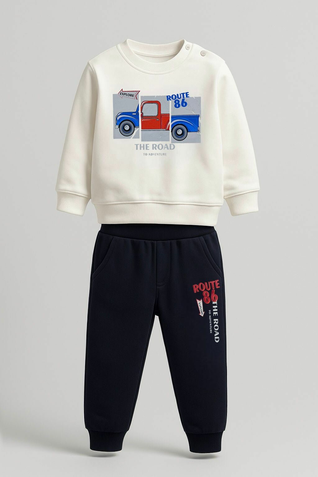 Chłopięcy dres z motywem auta w drodze w kolorze kremowym