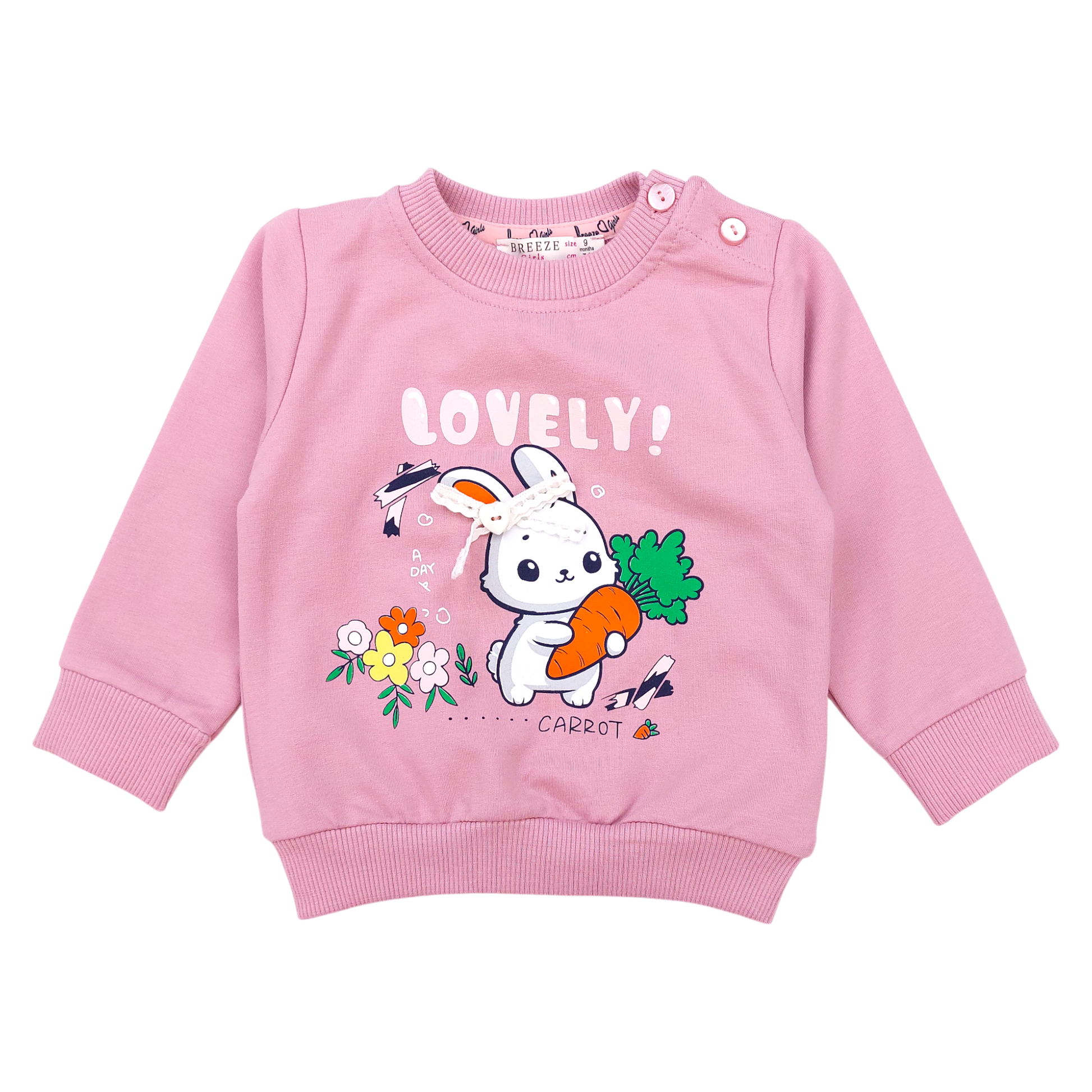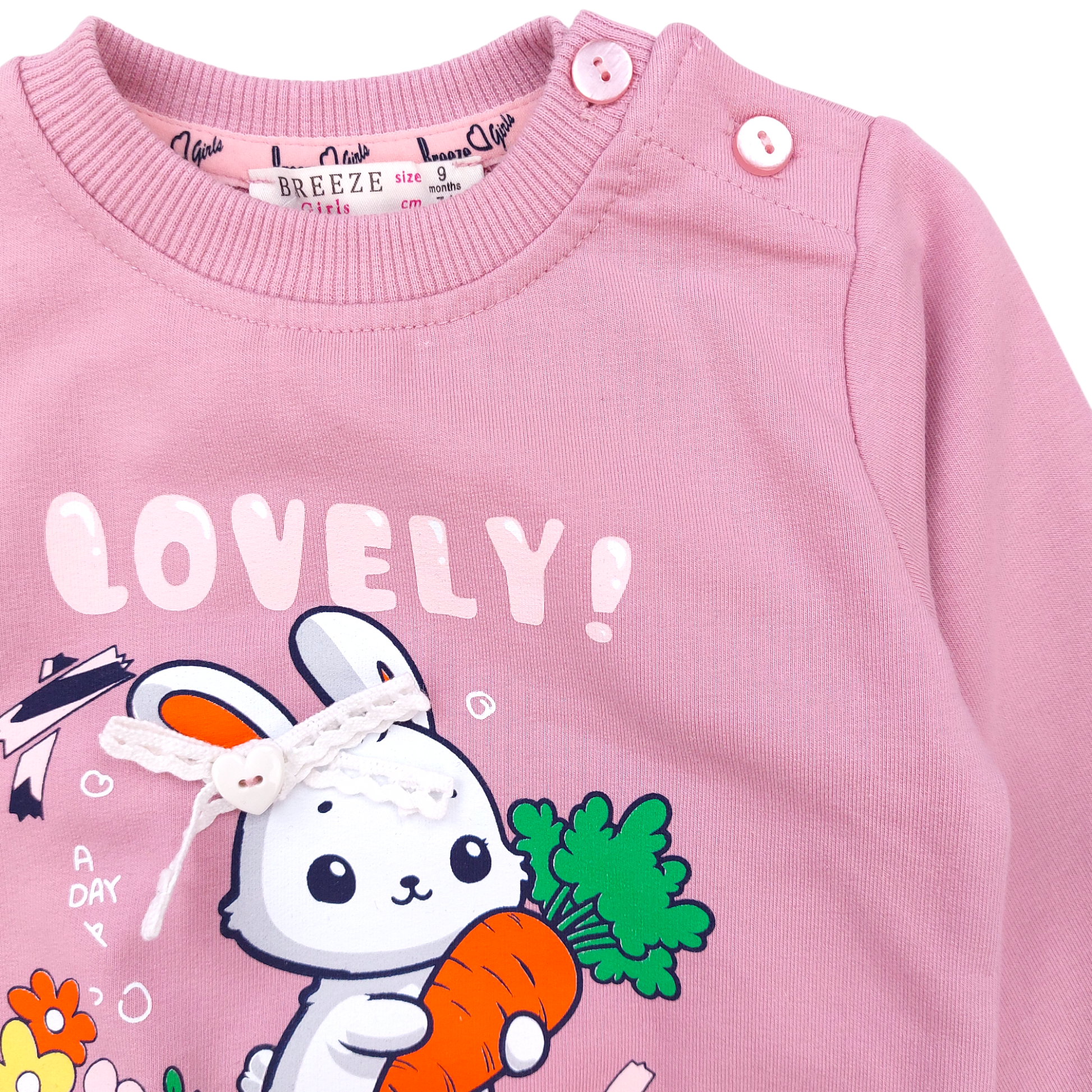 Uroczy dres dziewczęcy Breeze to idealny zestaw dla każdej małej księżniczki, która ceni sobie wygodę i styl. Bluza z długim rękawem wykonana z wysokiej jakości bawełny z dodatkiem elastanu, zapewnia komfort noszenia oraz odpowiednią elastyczność. Wyróżnia ją piękny nadruk króliczka trzymającego marchewkę oraz napis "Lovely!", który dodaje bluzie uroku. Praktyczne zapięcia na ramieniu ułatwiają zakładanie i zdejmowanie bluzy, co jest szczególnie wygodne w codziennym użytkowaniu.