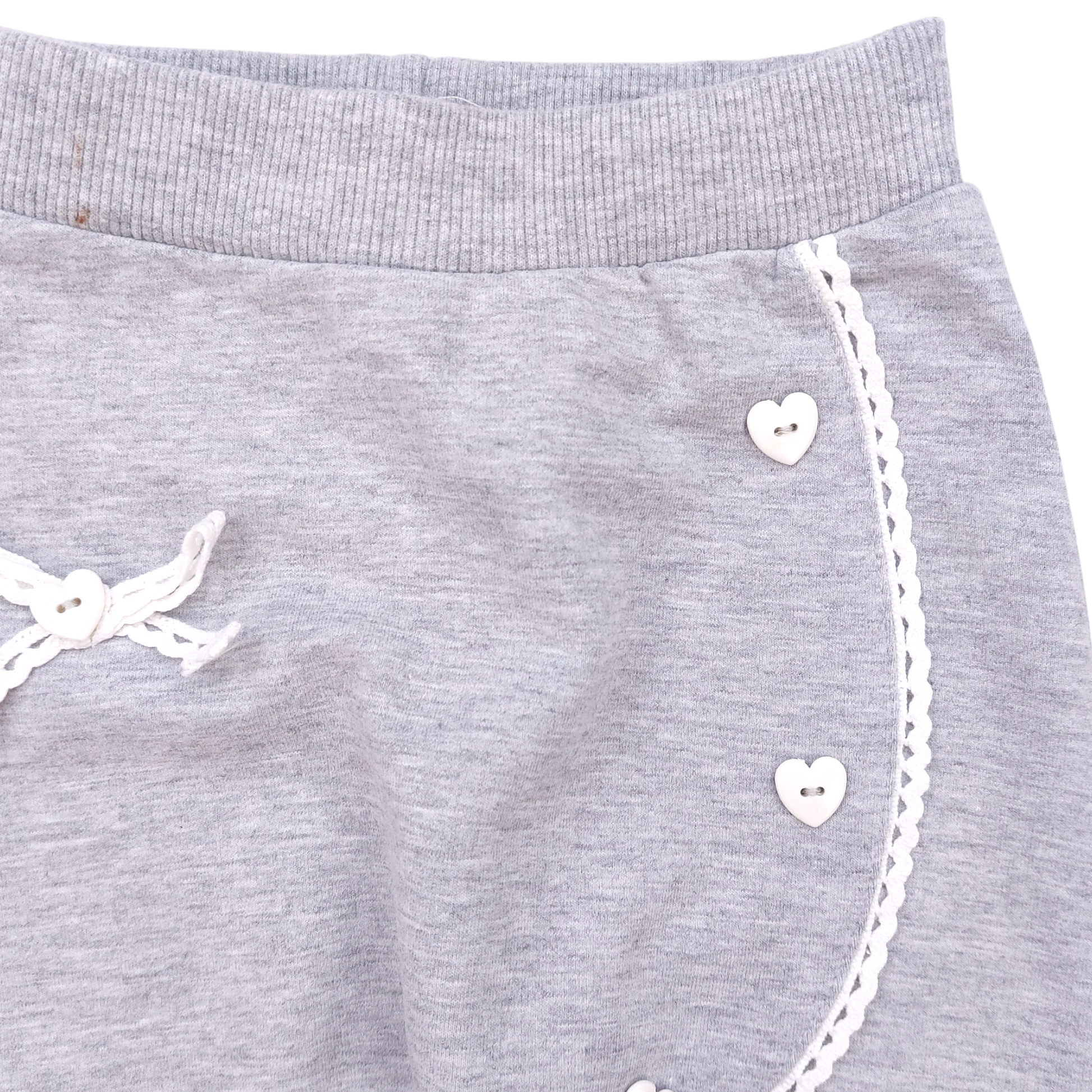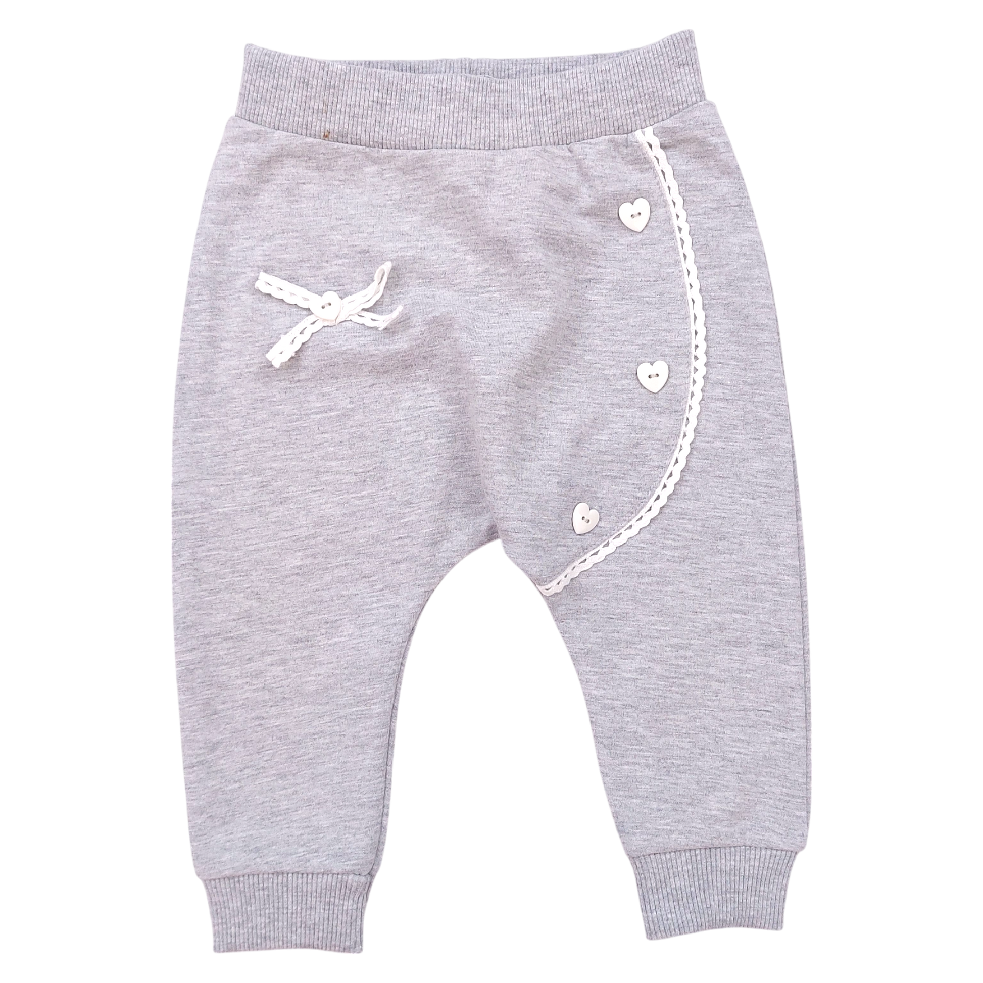 Spodnie w odcieniu szarości, z elastycznym pasem i ściągaczami przy nogawkach, zapewniają swobodę ruchów podczas zabawy. Delikatne dekoracyjne wstawki z koronką oraz guziki w kształcie serduszek nadają im wyjątkowego charakteru. Dzięki solidnemu wykonaniu i przyjemnemu w dotyku materiałowi spodnie doskonale sprawdzą się w codziennych stylizacjach, a ich uniwersalny design pozwala na łatwe dopasowanie do innych elementów garderoby.