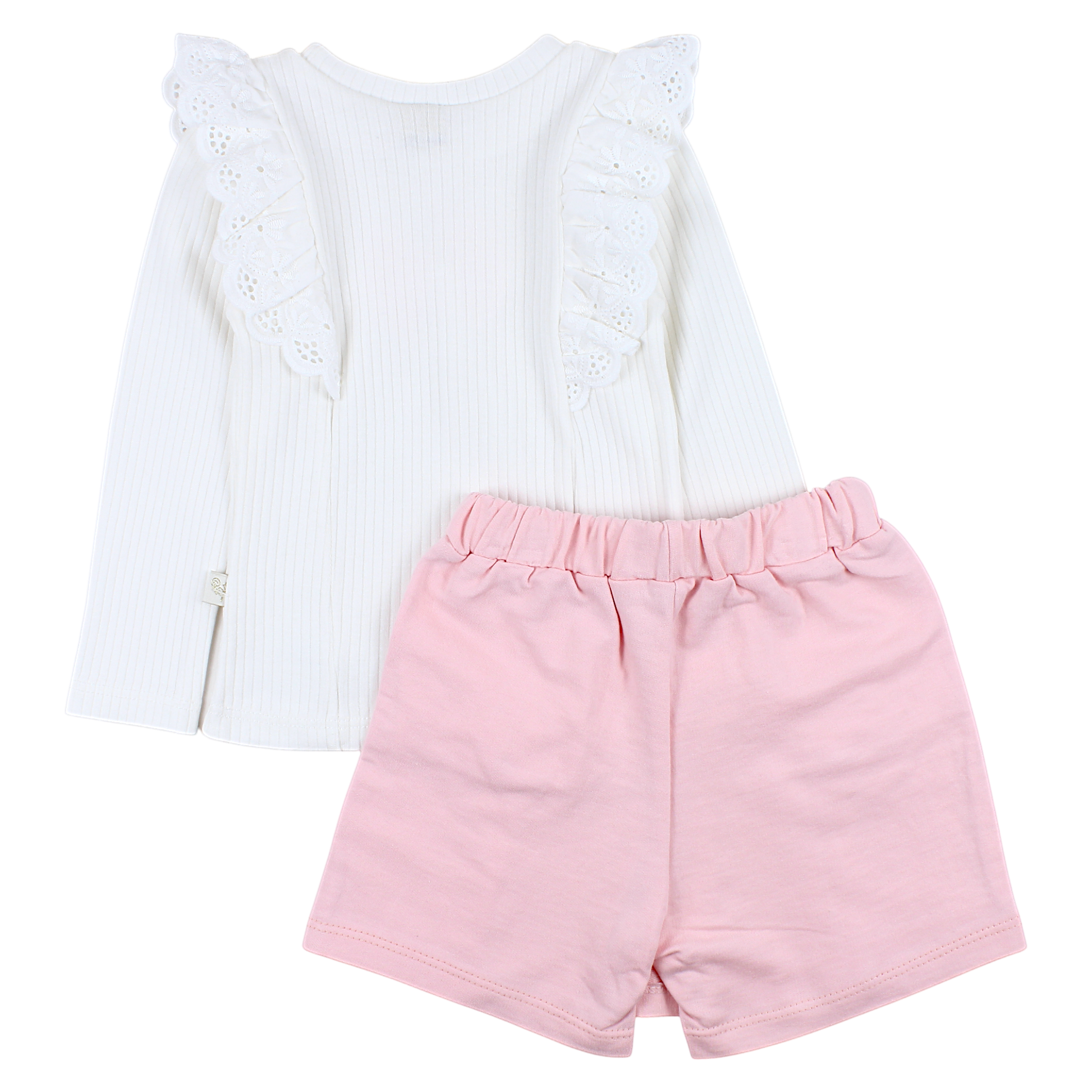 Uroczy komplet dziewczęcy w kolorze kremowym z delikatnymi akcentami różu. Składa się z bluzeczki z długimi rękawami, ozdobionej falbankami na ramionach i uroczym kokardkiem na przodzie. Do kompletu dołączone są wygodne spódnico-szorty z elastyczną talią, wykończone dekoracyjnymi kokardkami. Doskonały wybór na wiosenno-letnie dni.