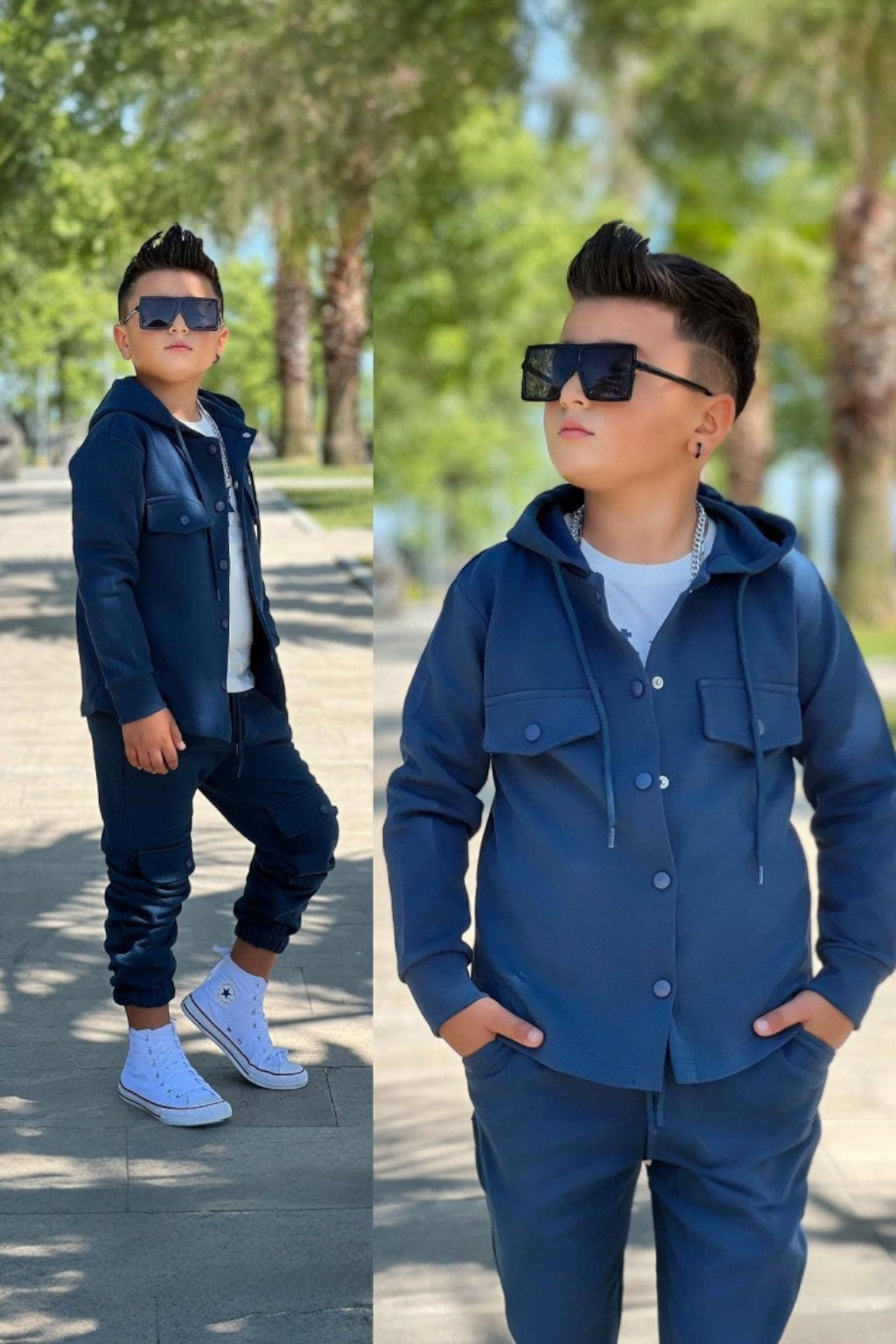 Elegancki i sportowy komplet chłopięcy w kolorze granatowym marki Surprise to idealne połączenie stylu i wygody. Zestaw składa się z bluzki oraz dresowych spodni. Bluzka ma klasyczny krój z długimi rękawami, a spodnie posiadają elastyczną talię dla lepszego dopasowania. Komplet jest wykonany z miękkiej bawełny, co zapewnia komfort noszenia. Idealny na co dzień i na specjalne okazje.