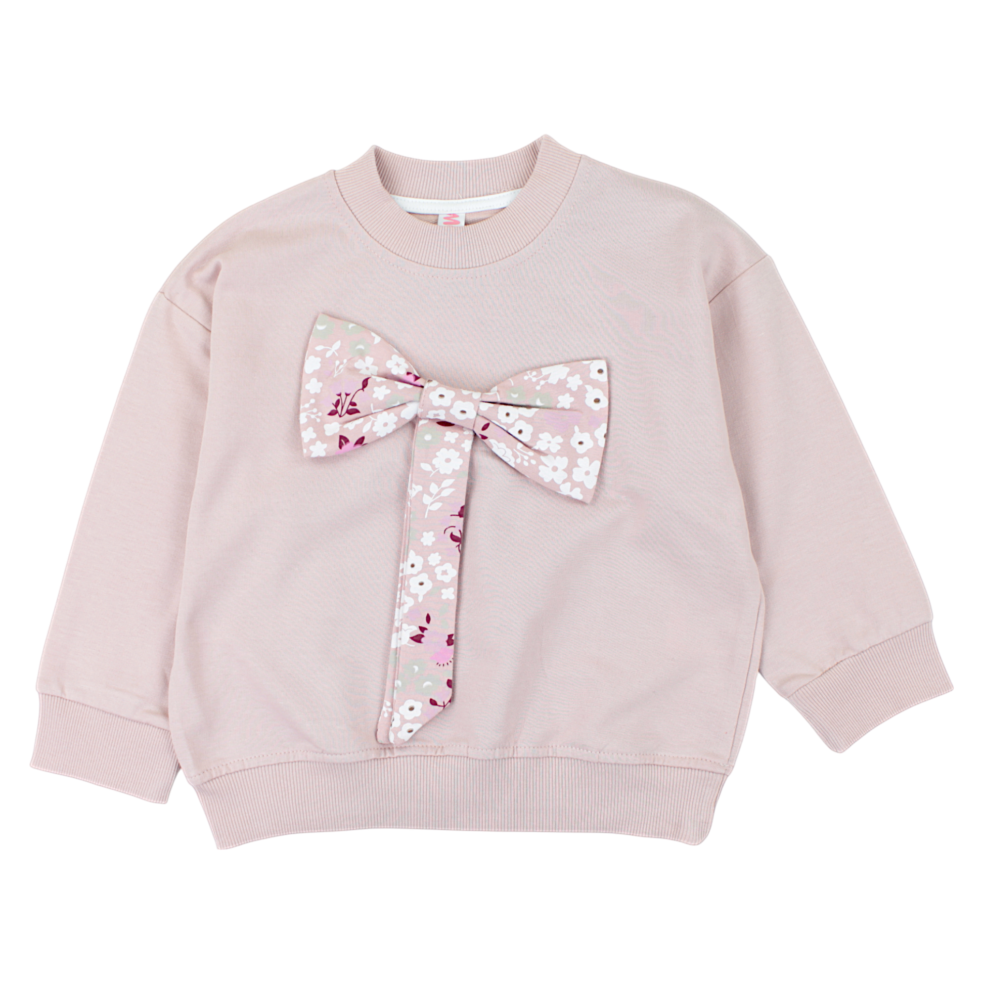 Komplet dziewczęcy z kokardą Mybella 259125-22125 to propozycja, która łączy styl i funkcjonalność, idealna na wiosenne i letnie dni. Góra zestawu to pastelowo-różowa bluza z długim rękawem, ozdobiona dużą kokardą w kwiatowym wzorze. Ta wyjątkowa aplikacja nadaje bluzie elegancji i czyni ją idealnym wyborem na różne okazje, od codziennych spacerów po rodzinne uroczystości. Dół zestawu to legginsy z identycznym kwiatowym motywem, które świetnie uzupełniają stylizację.