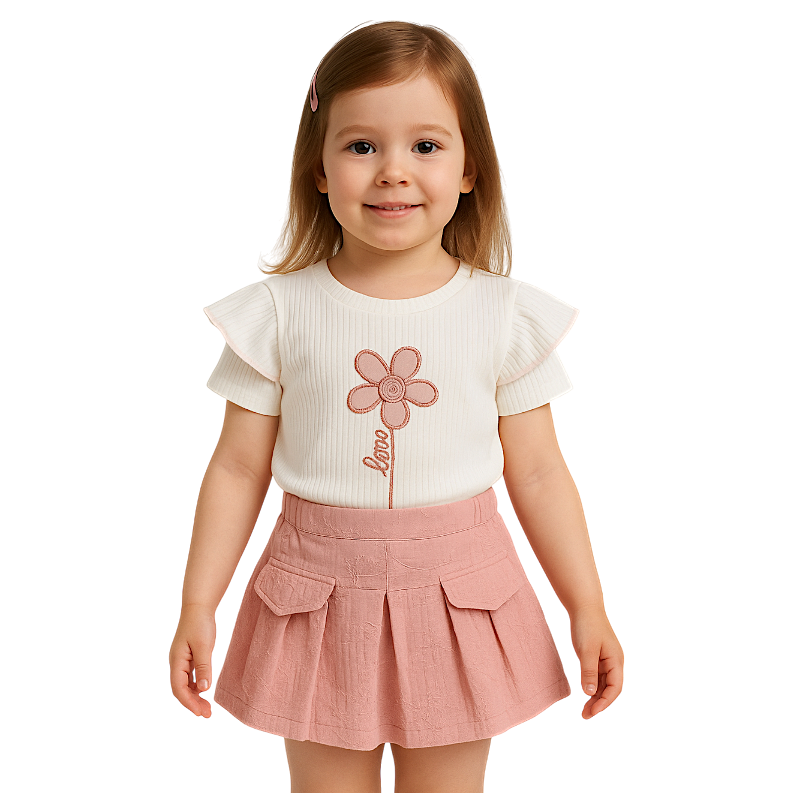 Prezentujemy uroczy komplet dla dziewczynki w modnym odcieniu pudrowego różu. W zestawie znajduje się elegancka spódnico-spodenki oraz dopasowana bluzka, które razem tworzą harmonijny wygląd. Wysokiej jakości materiał, jakim jest 100% bawełna, zapewnia komfort noszenia i długotrwałość. Spódnico-spodenki mają elastyczny pas dla dodatkowej wygody, a bluzka wyróżnia się subtelnym wzorem, który podkreśla dziewczęcy urok. Ten zestaw jest idealny na ciepłe dni, zapewniając jednocześnie stylowy wygląd.