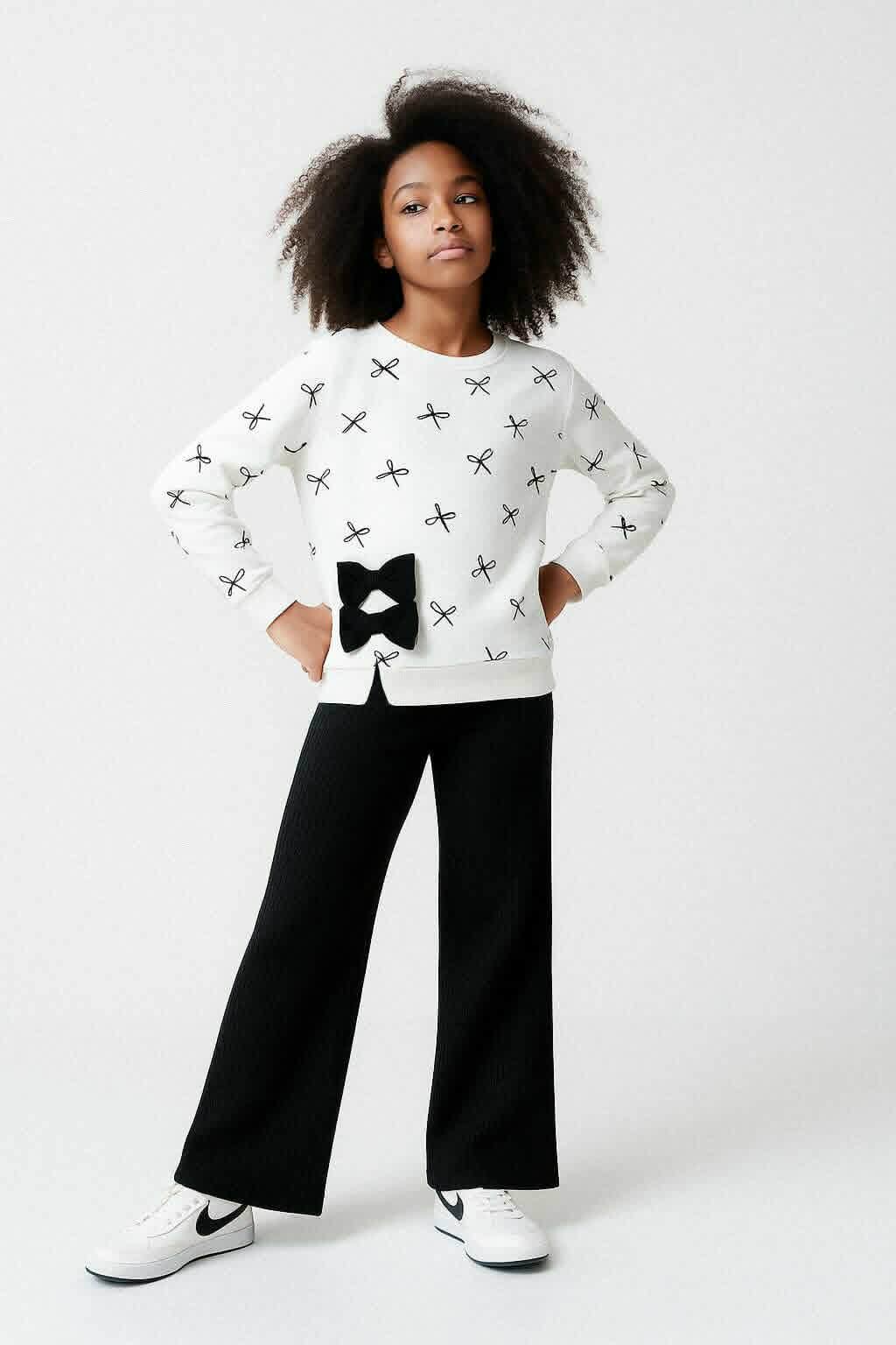 Uroczy komplet dziewczęcy składający się z kulotów i bluzki, idealny na sezon jesień-zima. Wykonany w delikatnym kremowym kolorze, komplet charakteryzuje się eleganckimi kokardkami dodającymi dziewczęcego uroku. Kuloty mają luźny krój, zapewniający swobodę ruchów, a bluzka posiada subtelne detale, które podkreślają jej wyjątkowy styl. Idealny wybór na każdą okazję, zarówno na co dzień, jak i na specjalne wyjścia.