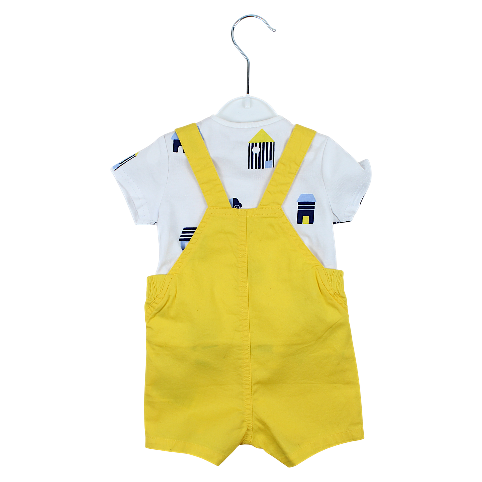 Uroczy komplet dziecięcy składający się z bawełnianej koszulki z krótkim rękawem oraz żółtych szortów typu ogrodniczki. Koszulka zapinana z boku na zatrzaski, ozdobiona motywem autek i domków w odcieniach niebieskiego. Ogrodniczki wykonane z przyjemnej w dotyku bawełny, posiadają regulowane szelki zapinane na guziki oraz kieszonkę na piersi i sznurek w pasie dla lepszego dopasowania. Całość idealnie sprawdzi się na wiosnę i lato dla chłopczyka. S