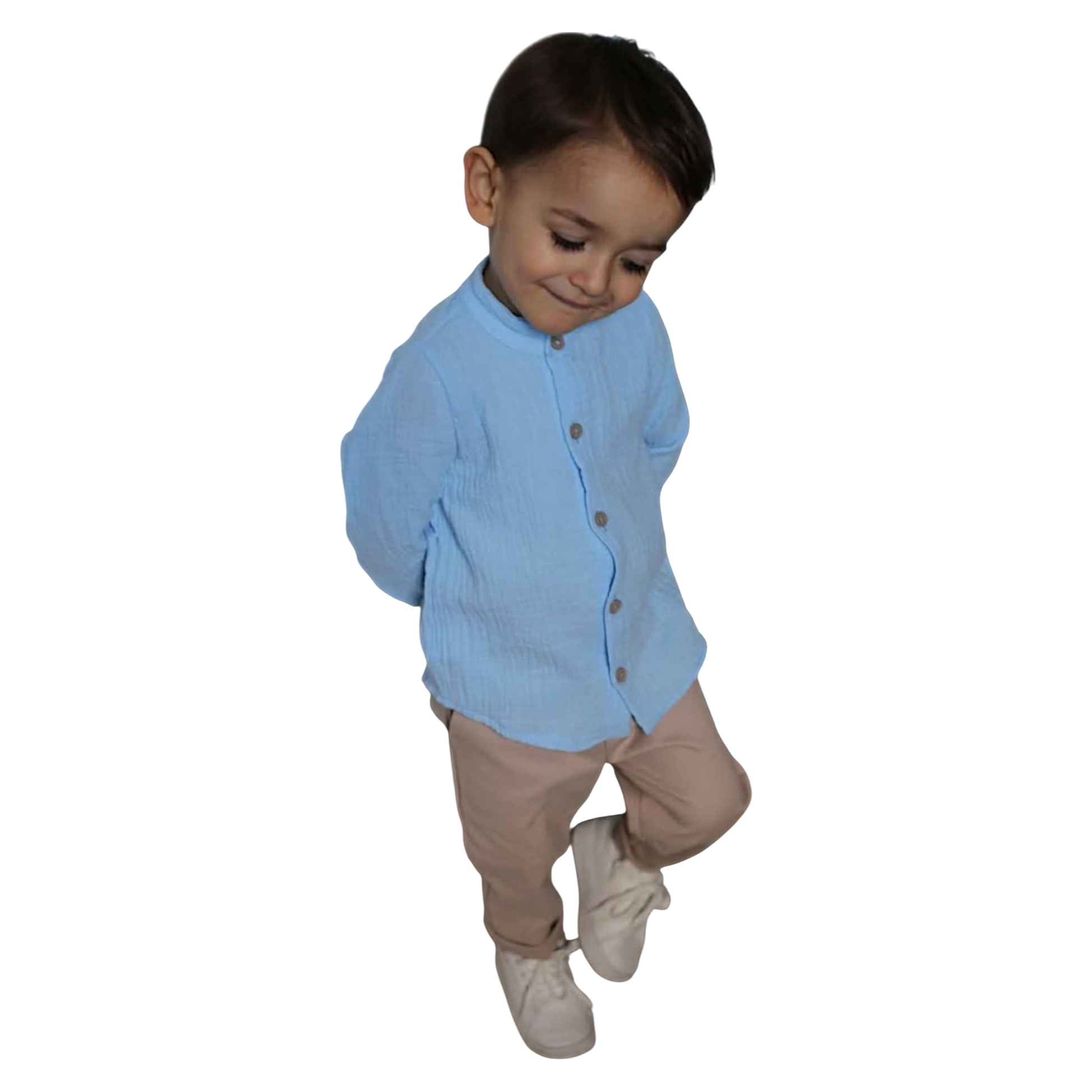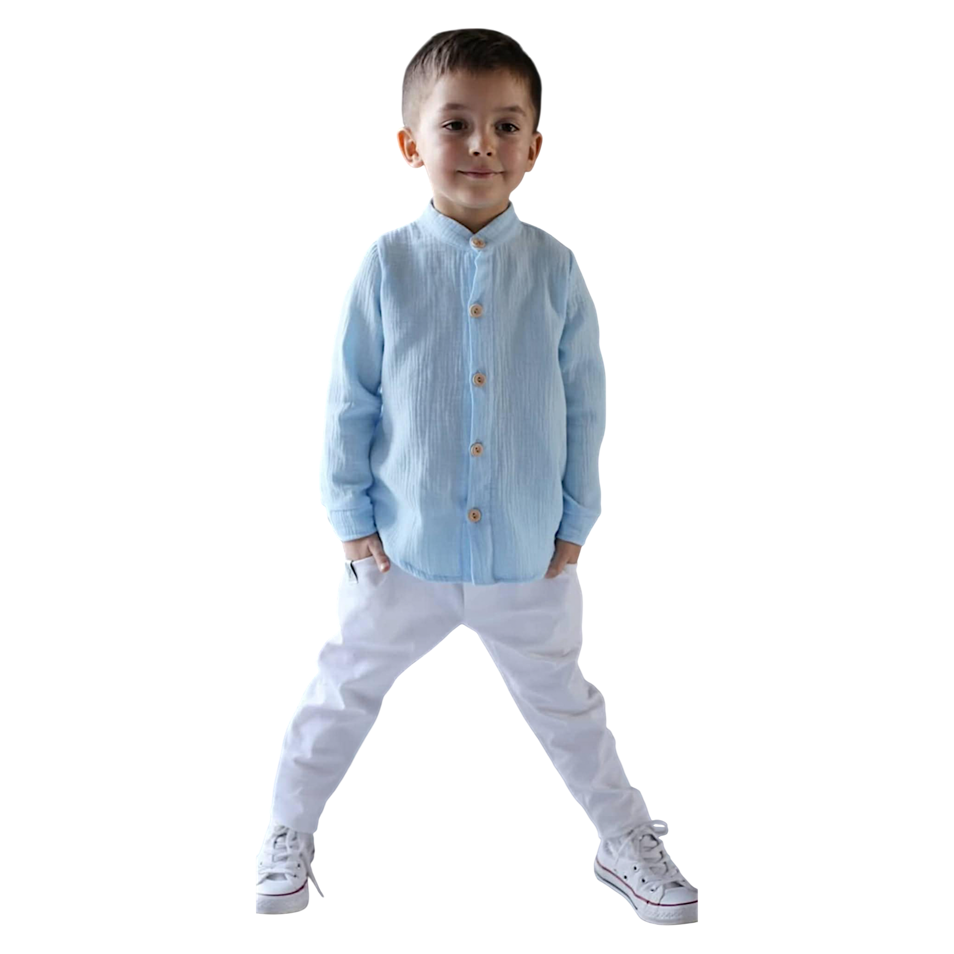Chłopięca koszula muślinowa w odcieniu eleganckiego niebieskiego z kolekcji Royal Kids to idealny wybór na ciepłe dni wiosenno-letnie. Wykonana jest z miękkiej tkaniny, co zapewnia wygodę i komfort noszenia. Koszula posiada klasyczne zapięcie na guziki, a stójka dodaje jej oryginalności. Jest to uniwersalny element garderoby pasujący do różnych stylizacji, zarówno na co dzień, jak i na wyjątkowe okazje.