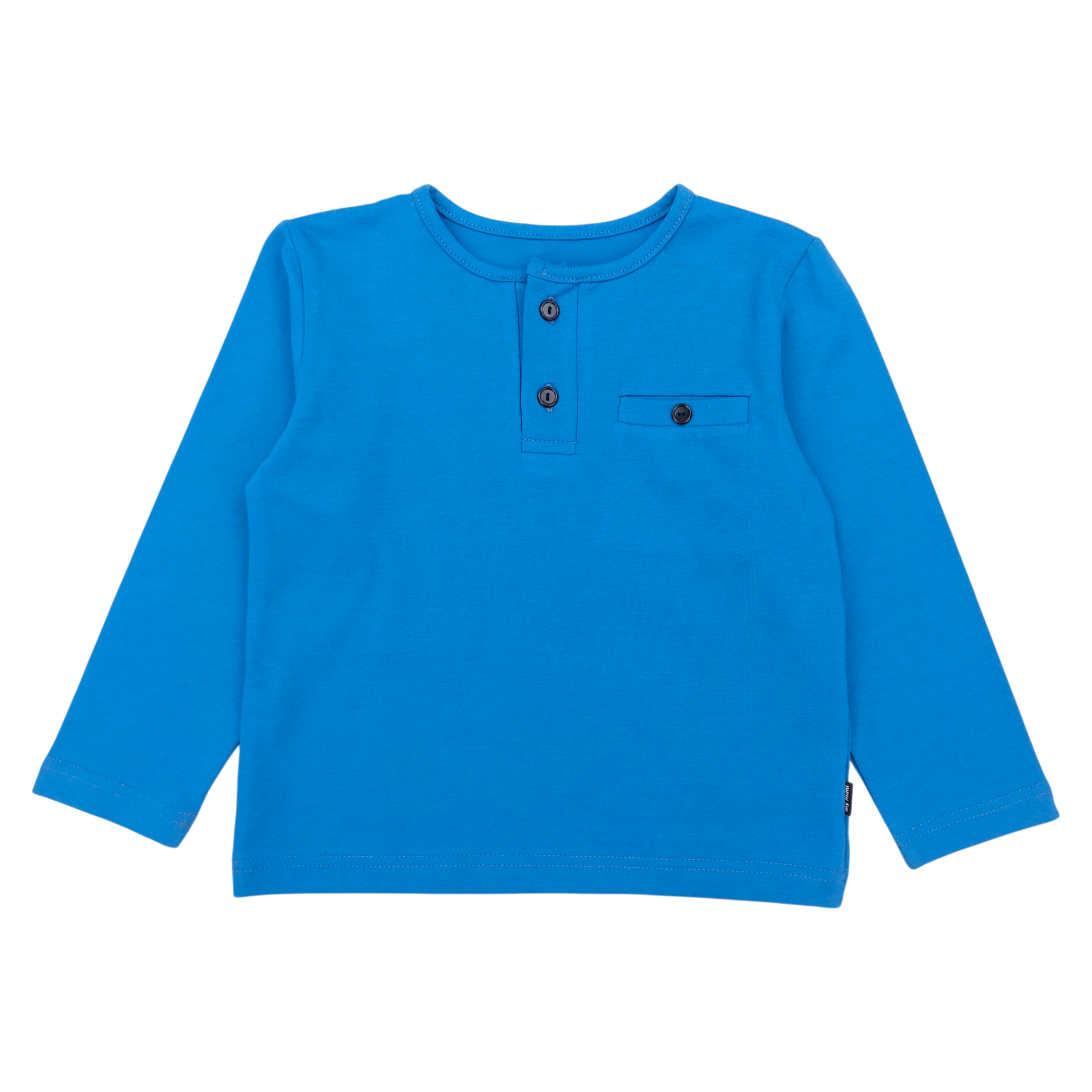 Stylowa koszulka chłopięca w kolorze niebieskim z długim rękawem, idealna na chłodniejsze dni sezonu jesień-zima. Model ozdobiony jest guzikami przy dekolcie oraz imitacją kieszonki na piersi, dodającymi uroku. Wykonana z wysokiej jakości materiału, zapewnia wygodę i swobodę ruchów.
