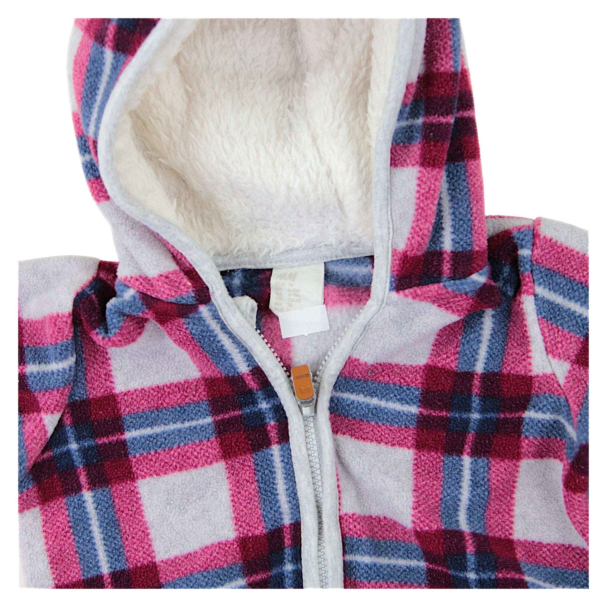 Urocza ocieplana bluza z kapturem dla dziewczynki od marki H&M. Bluza zapinana na zamek błyskawiczny, wykonana z miękkiego materiału w różową kratę. Kaptur wykończony puszystym polarem oraz ozdobiony uszami misia, co nadaje jej wyjątkowego, dziecięcego uroku. Długi rękaw oraz elastyczne wykończenia gwarantują komfort i ciepło. Idealna na chłodniejsze dni w sezonie wiosna-lato.