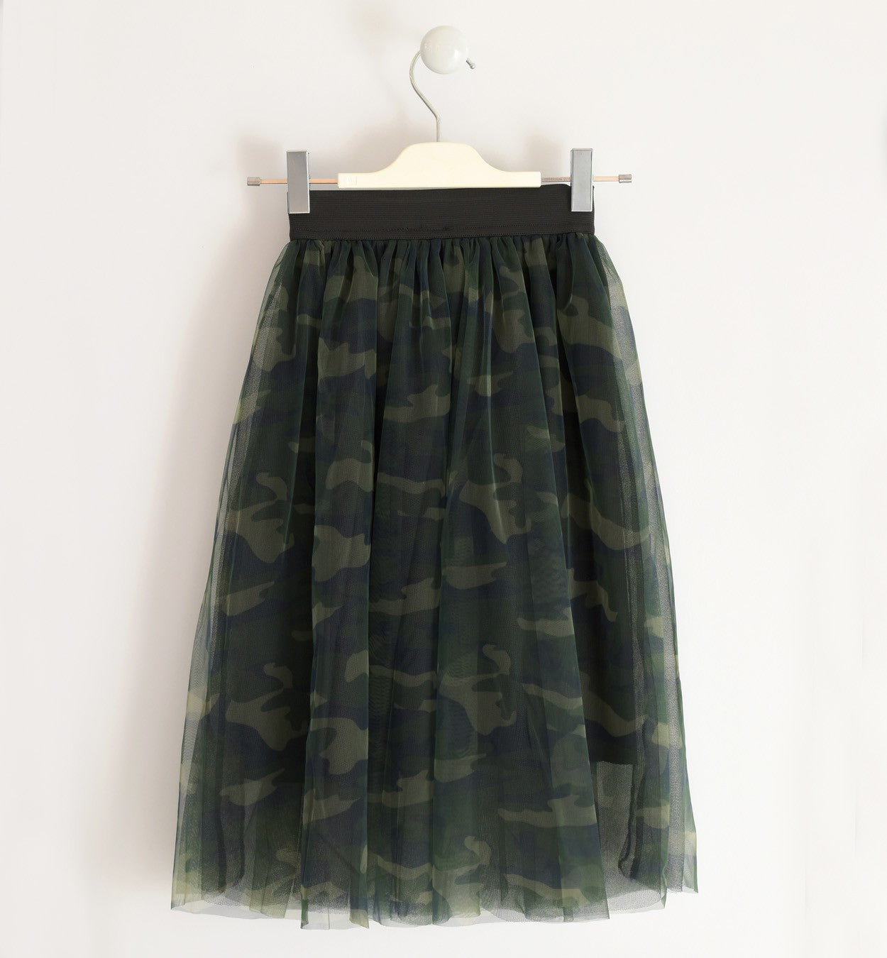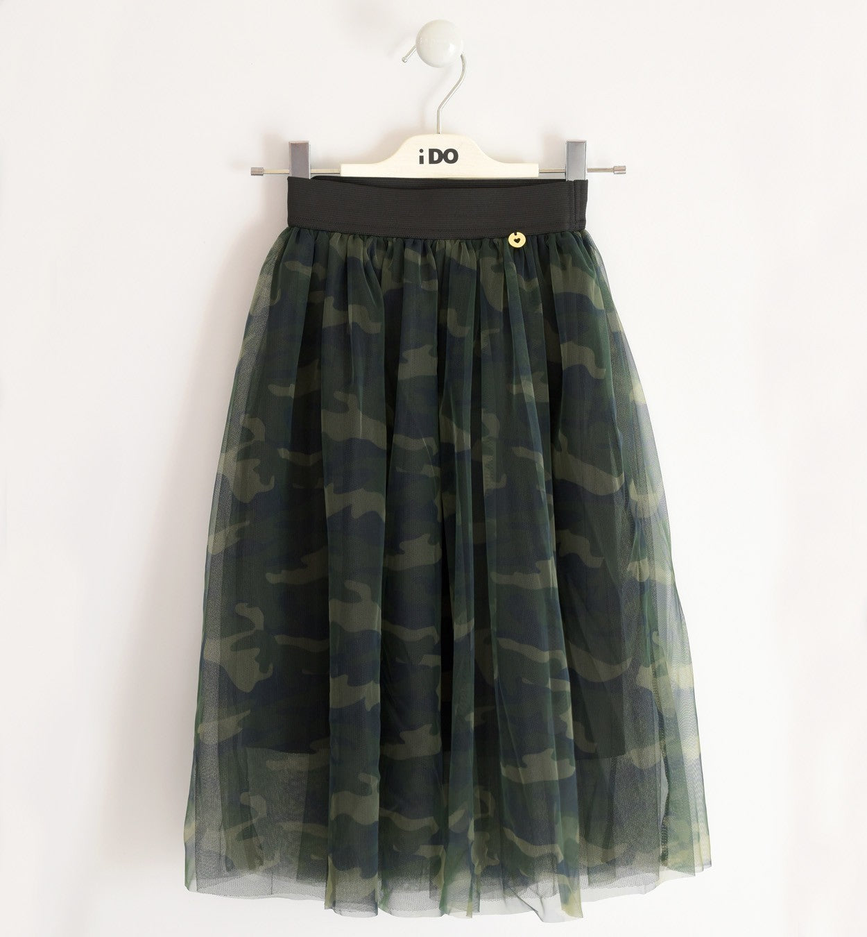 Spódnica tiulowa dla dzieci z nadrukiem moro na gumce w pasie dla dziewczynki iDO z kolekcji wiosna lato kod produktu J858 kolor 6MT1 zielony. Ubranka dla dzieci.