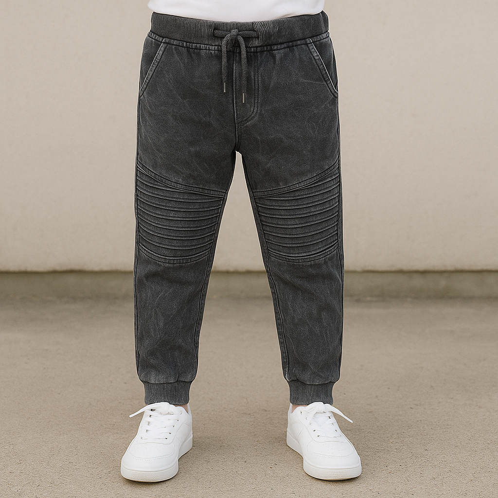 Szary, dekatyzowany materiał nadaje spodniom oryginalności i nowoczesnego wyglądu. Strukturalne przeszycia na wysokości kolan dodają im młodzieżowego charakteru i odrobiny sportowego stylu, który przypadnie do gustu każdemu chłopcu. Dzięki neutralnej barwie szarości spodnie te świetnie komponują się z wieloma kolorami, co sprawia, że łatwo zestawisz je z ulubioną bluzą, koszulką czy kurtką.