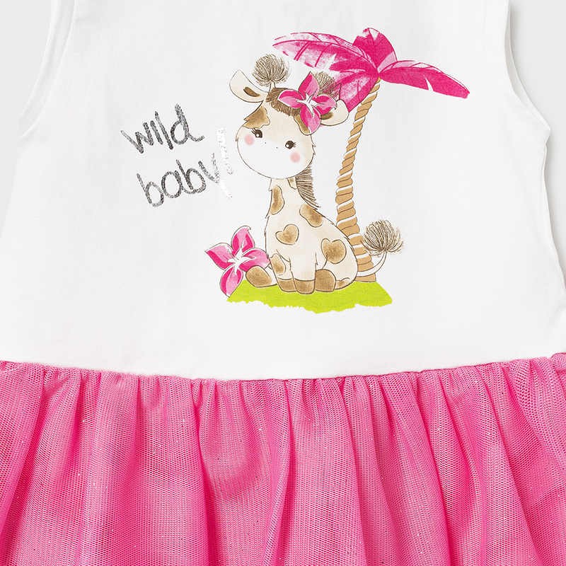 Sukienka 2-częściowa dla dzieci koszulka w paski z wiązaniem oraz sukienka na ramiączkach z nadrukiem i tiulem dziewczynka Mayoral z kolekcji baby girl z sezonu wiosna-lato kod produktu 1976 kolor 60 Różowy. Odzież dla dzieci.