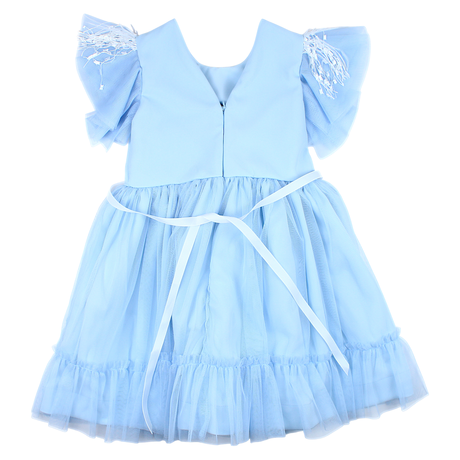 Dziewczęca sukienka wizytowa o uroczym niebieskim kolorze idealna na specjalne okazje. Wyróżnia się pięknymi kwiatowymi aplikacjami, które dodają jej elegancji i wyjątkowego charakteru. Sukienka posiada rękawki o kształcie skrzydełek oraz starannie wykończone falbanki na dole, co nadaje całości lekkości. Na przodzie znajduje się uroczy pasek ozdobiony kwiatem, który można dopasować do sylwetki. Sukienka z tyłu zapinana jest na guziki, co ułatwia zakładanie.