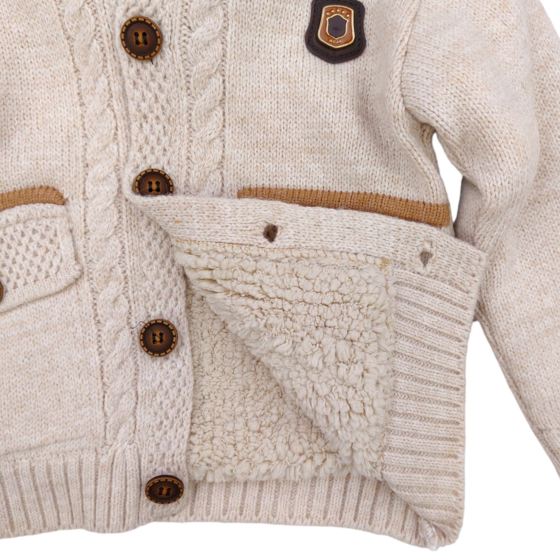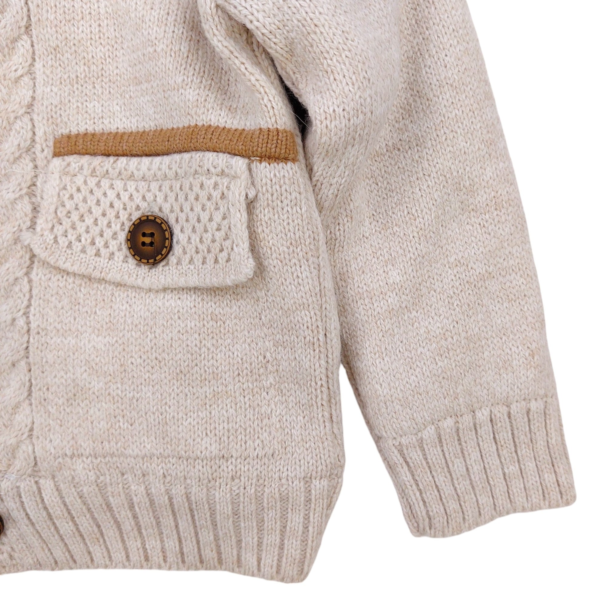 Sweter został wyposażony w miękki kaptur, który chroni przed chłodem i dodaje dodatkowego ciepła w wietrzne dni. Ocieplenie wewnątrz, wykonane z puszystego „baranka”, zapewnia Twojemu dziecku komfort termiczny nawet podczas mroźnej pogody. Sweter jest zapinany na guziki, co pozwala na łatwe zakładanie i zdejmowanie, co z pewnością docenią zarówno rodzice, jak i dzieci. Praktyczne kieszenie z przodu nie tylko wzbogacają design, ale także umożliwiają schowanie drobnych przedmiotów lub ogrzanie rączek.