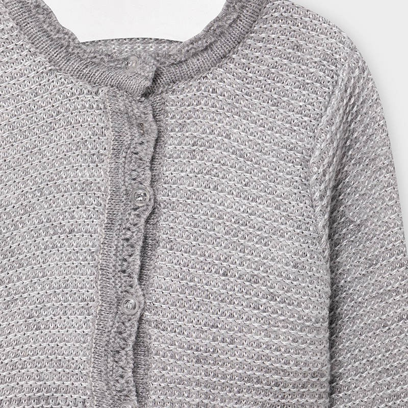 Sweter dla dzieci rozpinany dzianinowy z ozdobna falbanką dziewczynka Mayoral z kolekcji baby girl z sezonu jesień-zima kod produktu 2360 kolor 17 Szary. Odzież dla dzieci.
