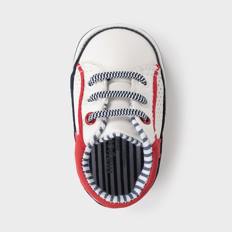 Tenisówki dla dzieci niechodki chłopiec Mayoral z kolekcji newborn boy z sezonu wiosna-lato kod produktu 9397 kolor 81 Biały/czerwony. Ubranka dla noworodka.