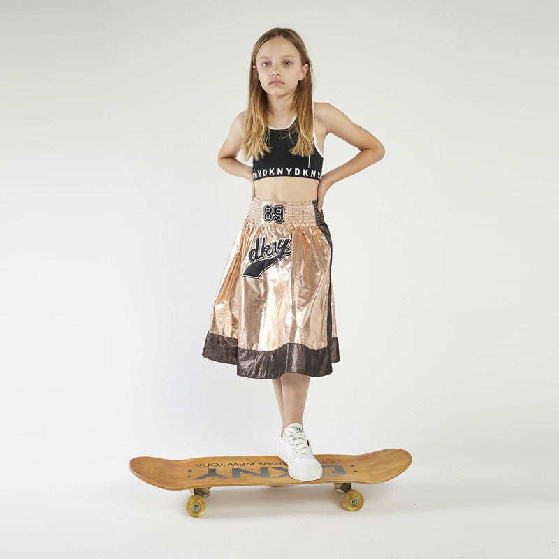 Top sportowy krótki z nadrukiem dla dziewczynek DKNY z kolekcji wiosna-lato kod produktu D35R19-09B kolor czarny. Ubrania dziecięce.